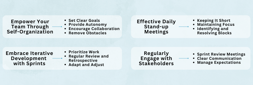 Scrum is a powerful framework for managing projects and leading teams. By empowering your team through self-organization, embracing iterative development, conducting effective daily stand-up meetings, and regularly engaging with stakeholders, you can keep your project on track and deliver value to your customers efficiently. Remember that Scrum is not a one-size-fits-all approach; adapt it to your team’s specific needs and continuously improve your practices to achieve better results with each sprint.